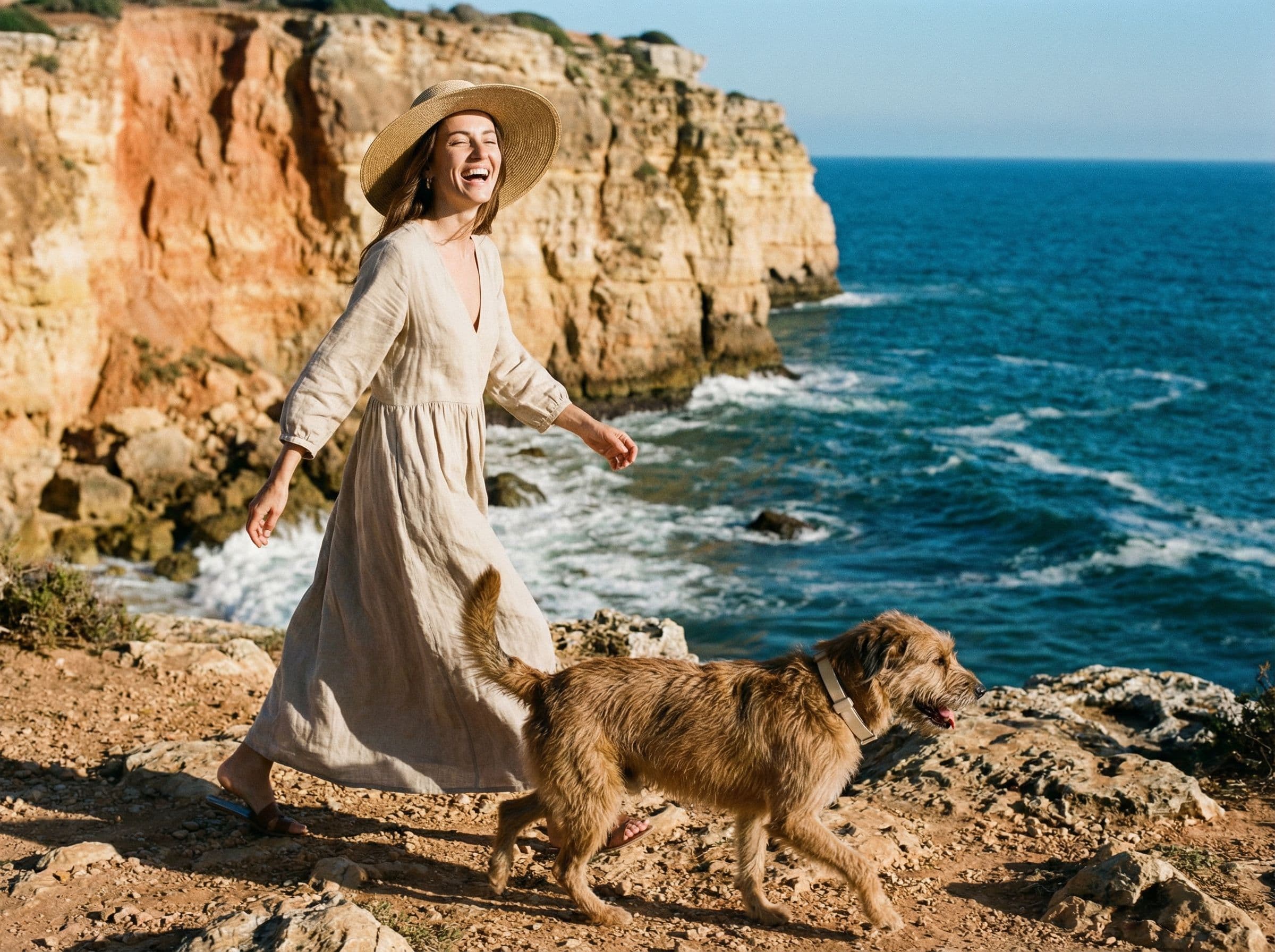Real dogs wearing Luvina Pet in European environments—forest trails, beach swims, and city parks.